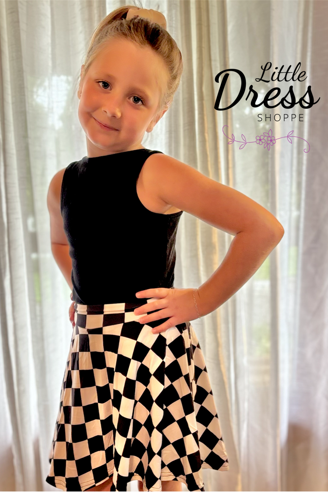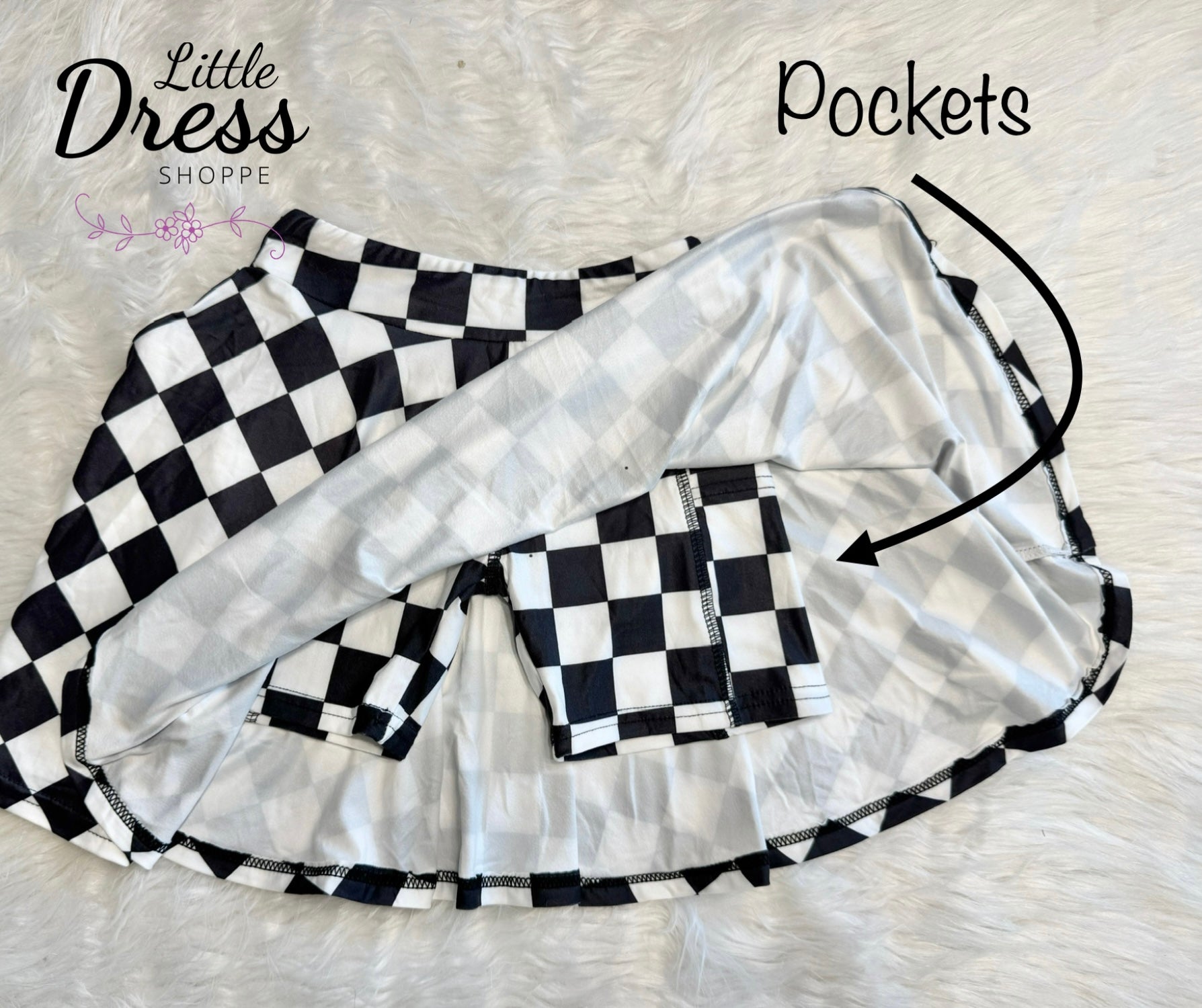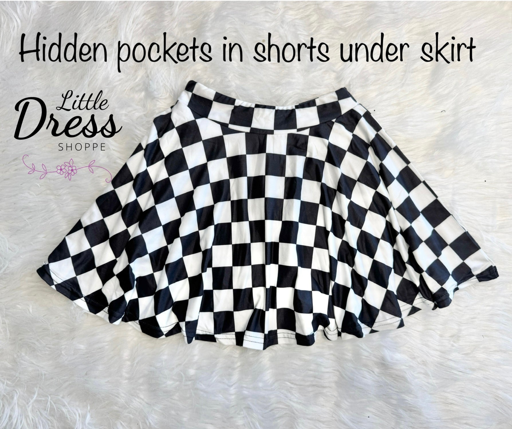 Skorts are so cute and in style for all ages!  This adorable skort comes in kids and adult sizes.  The checker pattern makes it so versatile for matching with almost anything!  It comes in sizes XS youth to TC2 in adult.  Made from 93 percent polyester and 7 percent spandex its so soft.  Or course it twirls and has hidden pockets!