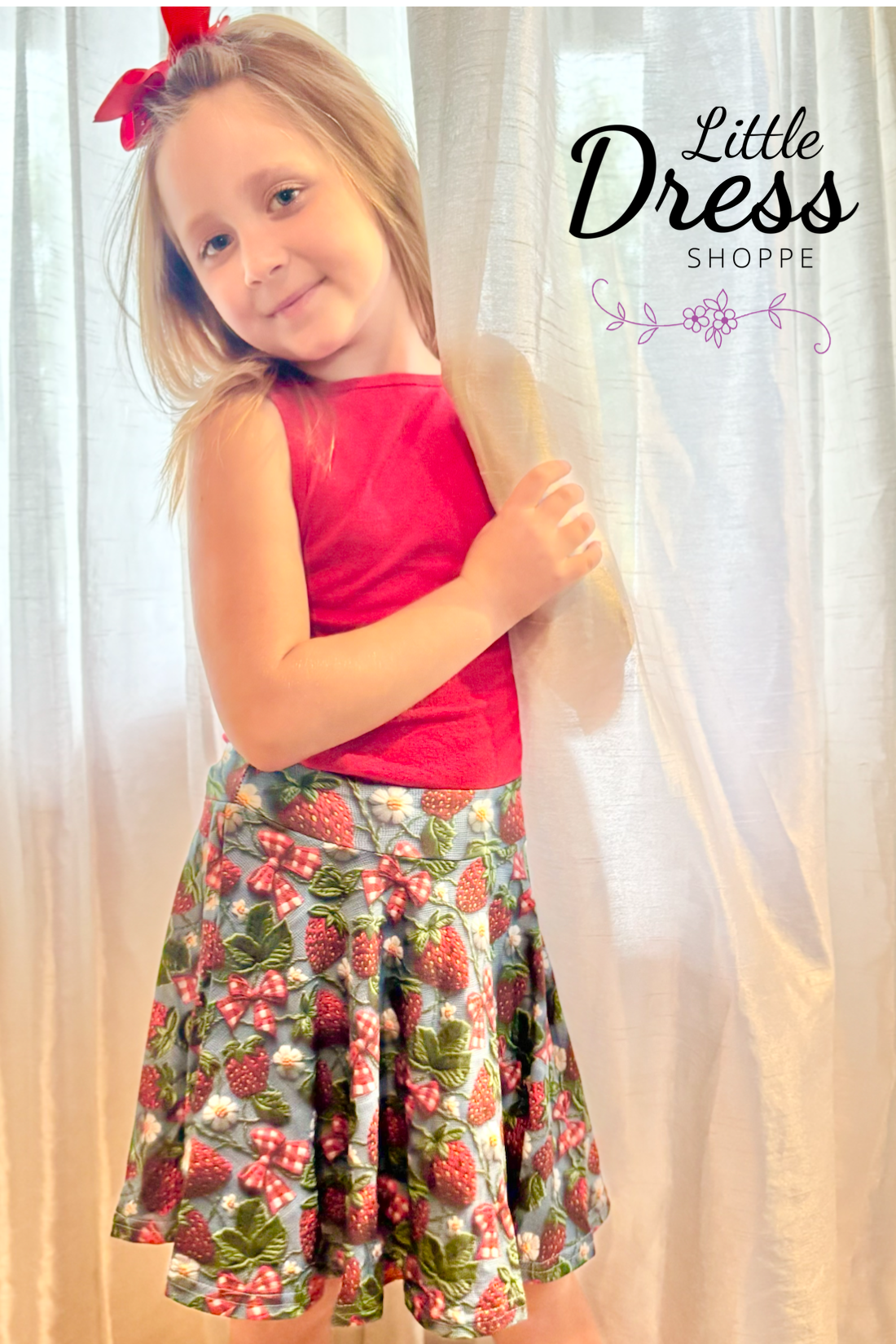 Skorts are so cute and in style for all ages! This adorable skort comes in kids and adult sizes. The strawberry pattern is so cute! It comes in sizes XS youth to TC2 in adult. Made from 93 percent polyester and 7 percent spandex its so soft. Or course it twirls and has hidden pockets!